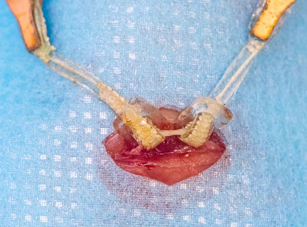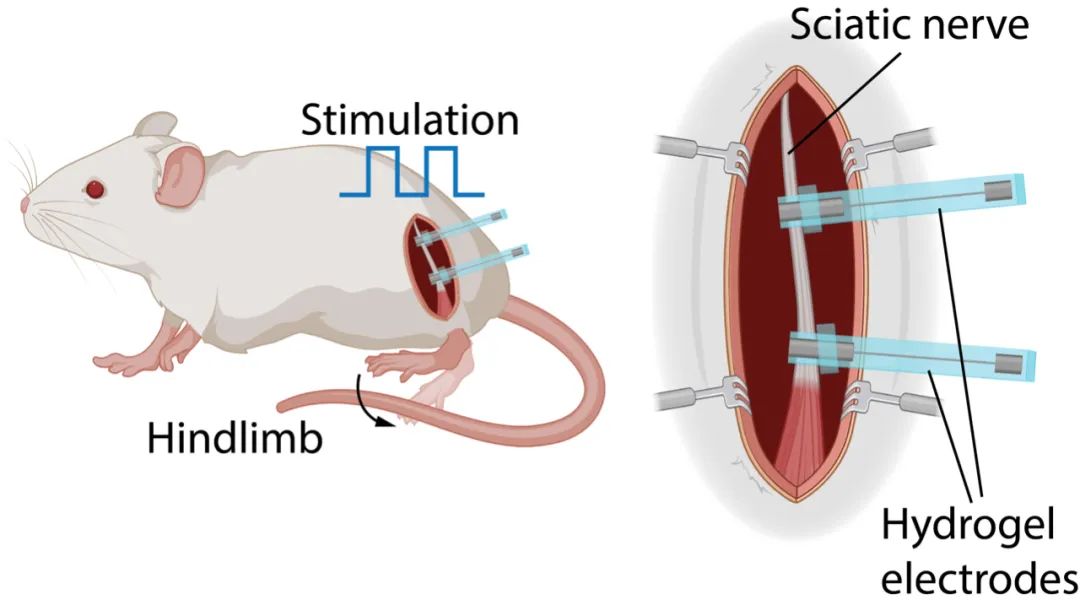而這套方法的“終極目標”,就是和生命體進行直接的“連接”,而這一點也在小鼠實驗上得到了非常成功的效果。實驗團隊制備了可用于提供電刺激的全水凝膠電極,可以通過簡單的手術纏繞在小鼠的坐骨神經上。在1Hz頻率的脈沖式電壓刺激下,3D打印電極可在低達100mV的電壓下引起小鼠腿部的規律大角度運動。而作為對照的離子導電水凝膠的電極則在250mV的的驅動電壓作用下也只可勉強引發小鼠腿部微小的運動。