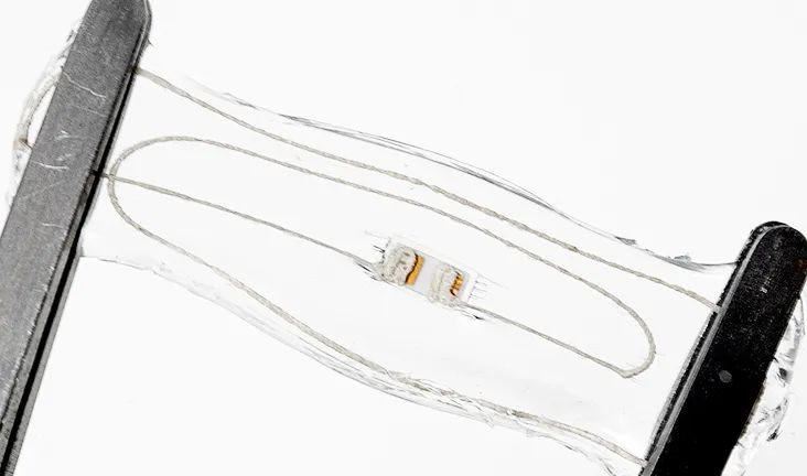 為了進一步驗證所開發的嵌入式3D打印的高度自動化程度,團隊人員利用了業界常用的pick-and-place( 拾取—放置)方式將有源LED器件置入水凝膠支撐基質中,并且實現了直接與LED連接的三維電感打印——也就是打印一個導電線圈,并可以利用電磁場接收能量,產生電壓,讓LED發光。通過對有源LED器件進行表面修飾,整個器件可以產生強韌的共價交聯,在一百次拉伸和壓縮大應變情況下可保持有效工作。
