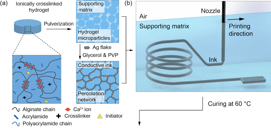 而研究團隊把這兩種水凝膠的固化分成了兩個獨立步驟——先固化海藻酸鈣,然后再“打碎”細化成為微凝膠微顆粒。這種凝膠顆粒中除了海藻酸鈣還包含了丙烯酰胺單體、交聯劑和自由基引發劑,粒徑在20微米左右,可以作為3D打印的“墨水”。打印完成后,再通過加熱引發聚丙烯酰胺的固化,讓電子器件最終定型。