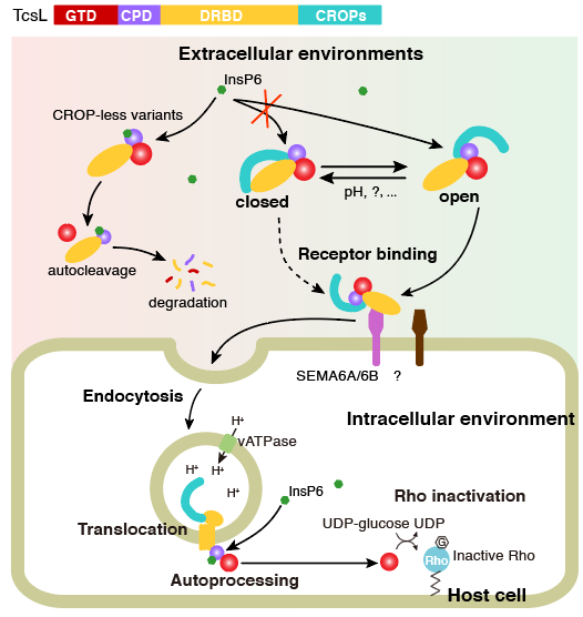基于上述發現,研究者們提出了一種組合重復寡肽區域調控TcsL及其它大梭菌毒素穩定性和毒性的模型(圖6)。作為一類外毒素,TcsL在被細菌釋放到胞外后將面臨各種復雜的環境條件。毒素可能以開放和關閉兩種構象存在,其中開放式構象的組合重復寡肽區域舒展,暴露出毒素的核心區,這種構象對于攻擊宿主細胞更為有利。而在一些相對嚴厲的條件下(如低pH值等),毒素傾向于轉變為關閉式的構象,這種構象分子結構更為緊密和牢固,不易發生自剪切和降解。這種構象更利于維持毒素的穩定性和活性,直至毒素分子接觸到其目標宿主細胞。