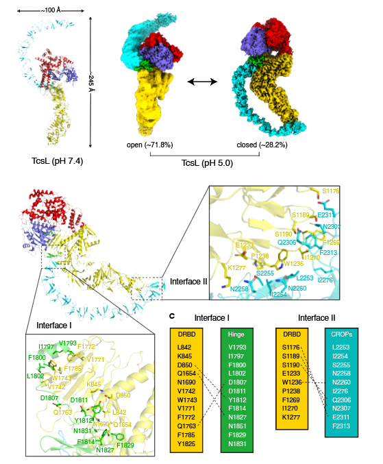 圖4. TcsL存在開放和關閉這兩種不同的構象,其中關閉式構象會形成兩個分子內作用界面