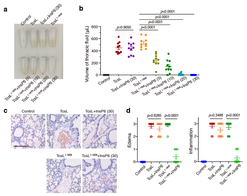 接下來,研究者們模擬了TcsL釋放到環境中,之后再接觸宿主的情形。利用小鼠攻毒模型結合病理分析,研究者發現缺少組合重復寡肽區域的TcsL在存在InsP6的環境中暴露僅僅20分鐘即會完全失活,這對于一種外毒素來說是不可接受的缺點。而全長的TcsL在類似環境下30分鐘也不會有任何活性損失(圖5)。最后,研究者們還將這一規律在大梭菌毒素家族的其他成員,包括TcdA,TcdB,TcsH和Tcnα中進行了驗證,發現它們的組合重復寡肽區域也有著類似的作用。