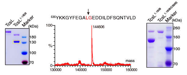 圖2. 缺失組合重復寡肽區域會造成TcsL中半胱氨酸蛋白酶活性失控