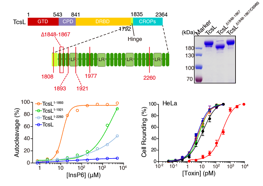 為了探究組合重復寡肽結構域的功能,研究團隊首先在枯草芽孢桿菌系統中表達了全長和組合重復寡肽缺失的TcsL蛋白。期間團隊成員發現了一個有趣的現象:組合重復寡肽缺失的TcsL在蛋白純化過程中會自發進行切割。通過質譜分析和突變實驗證實切割位點位于543位的亮氨酸和544位的甘氨酸,這是TcsL中的半胱氨酸蛋白酶的自剪切位點。在全長蛋白中,需要較高濃度的六磷酸肌醇(InsP6)才能激活半胱氨酸蛋白酶的自切割活性,這說明缺失組合重復寡肽結構會造成TcsL中的半胱氨酸蛋白酶活性失控變得過度活躍(圖2)。