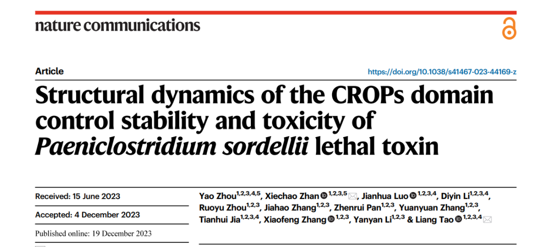 北京時間2023年12月19日,陶亮團隊與合作者在Nature Communications上在線發表題為“Structural dynamics of CROPs control the stability and toxicity of Paeniclostridium sordellii lethal toxin”的研究論文(圖1),揭示了TcsL的組合重復寡肽區域具有調控毒素自剪切和毒性的功能,并從生化、細胞和結構層面闡述了其工作機制;研究還進一步發現這種自調控機制在其它大梭菌毒素家族成員中也可能普遍存在。
